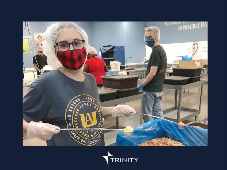 On a muggy summer evening in Dallas, Texas, nearly 20 “Trinitarians” gathered together to give to a wonderful cause. Serving with Feed My Starving Children – a Christian nonprofit organization dedicated to feeding underdeveloped children across the globe – our team hand-packaged 6,264 nutritious rice packs which equates to 29 boxes of food to feed 17 children in Kenya and Thailand for an entire year.